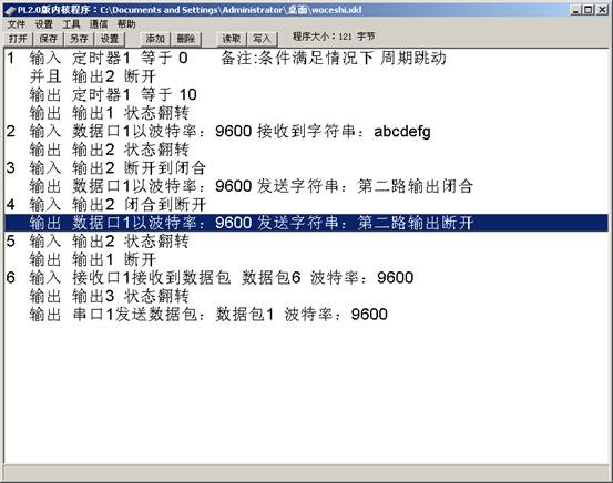 参数1为接收字符串的数据口,根据继电器模块的实际情况正确选择,关于数据口的说明请参看上面所述的“接收数据包”里面的说明,参数2代表波特率,本单位产品波特率固定为“9600”,数据3代表所接收的字符串的内容,字符串的内容根据用户需要自行编写