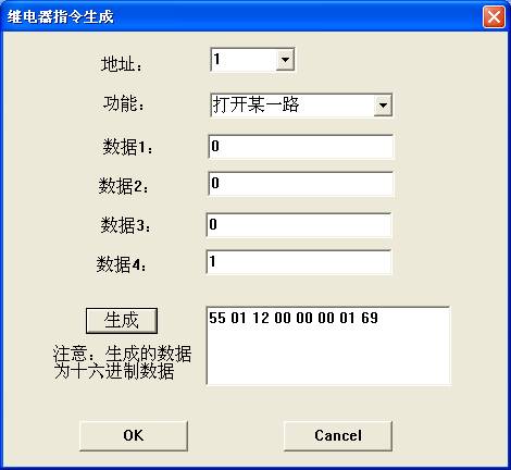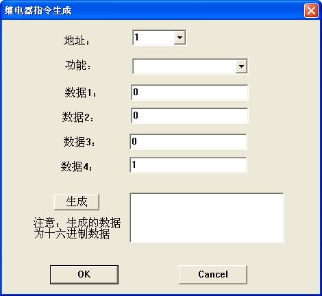 选择目标地址、选择所需功能、根据功能需要正确填写4个数据项,然后单击【生成】按钮,在右侧会出现一个16进制数据