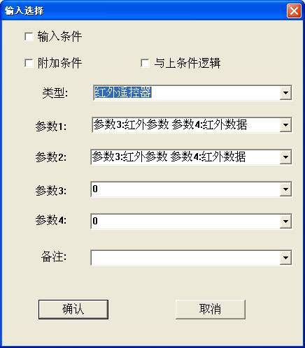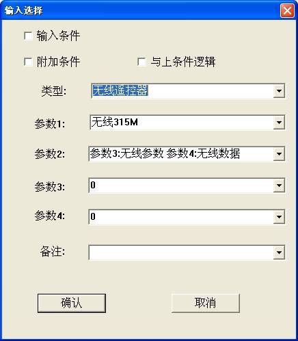 参数1代表遥控器的参数类型,本单位产品目前只支持315M无线设备,不支持433M,参数2为自动弹出,参数3和参数4为遥控器的参数,光标放到参数3的位置,按下遥控器,会自动弹出遥控器的参数,单击确定即可
