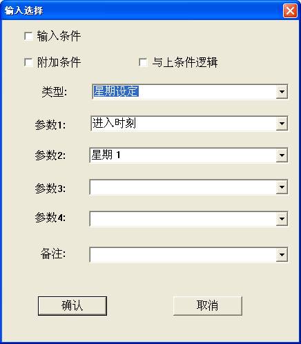 参数1是对所设置的星期的说明,包括(进入时刻、退出时刻、大于、小于、等于、大于等于、小于等于、不等于),参数2是所要设置的星期,包括(星期1、2、3、4、5、6、7、周一到周日、周一到周六、周一到周五、周一三五、周二四六、周六日)