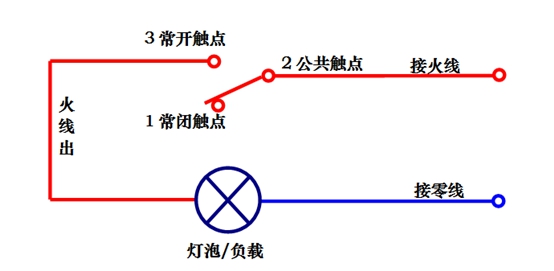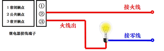继电器动作时电路公共触点和常开触点导通,灯泡就亮了。切记绝对禁止继电器的两个端子上同时接火线和零线!!!为保证人身安全绝对禁止带电操作!!!