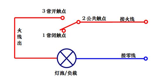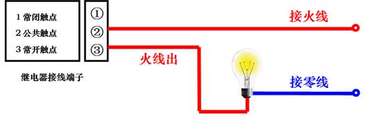 继电器动作时电路公共触点和常开触点导通,灯泡就亮了。切记绝对禁止继电器的三个端子上同时接火线和零线!!!为保证人身安全绝对禁止带电操作!!!